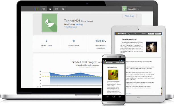 Accompany your students on a journey through our vast library of reading comprehension content. ReadTheory's adaptive approach fosters improvement by automatically meeting learners at their own, individual ability levels. Signup takes seconds and no time is spent vetting assignments. Progress is shown on an intuitive report, replete with actionable, meaningful insights. Our program is completely free.